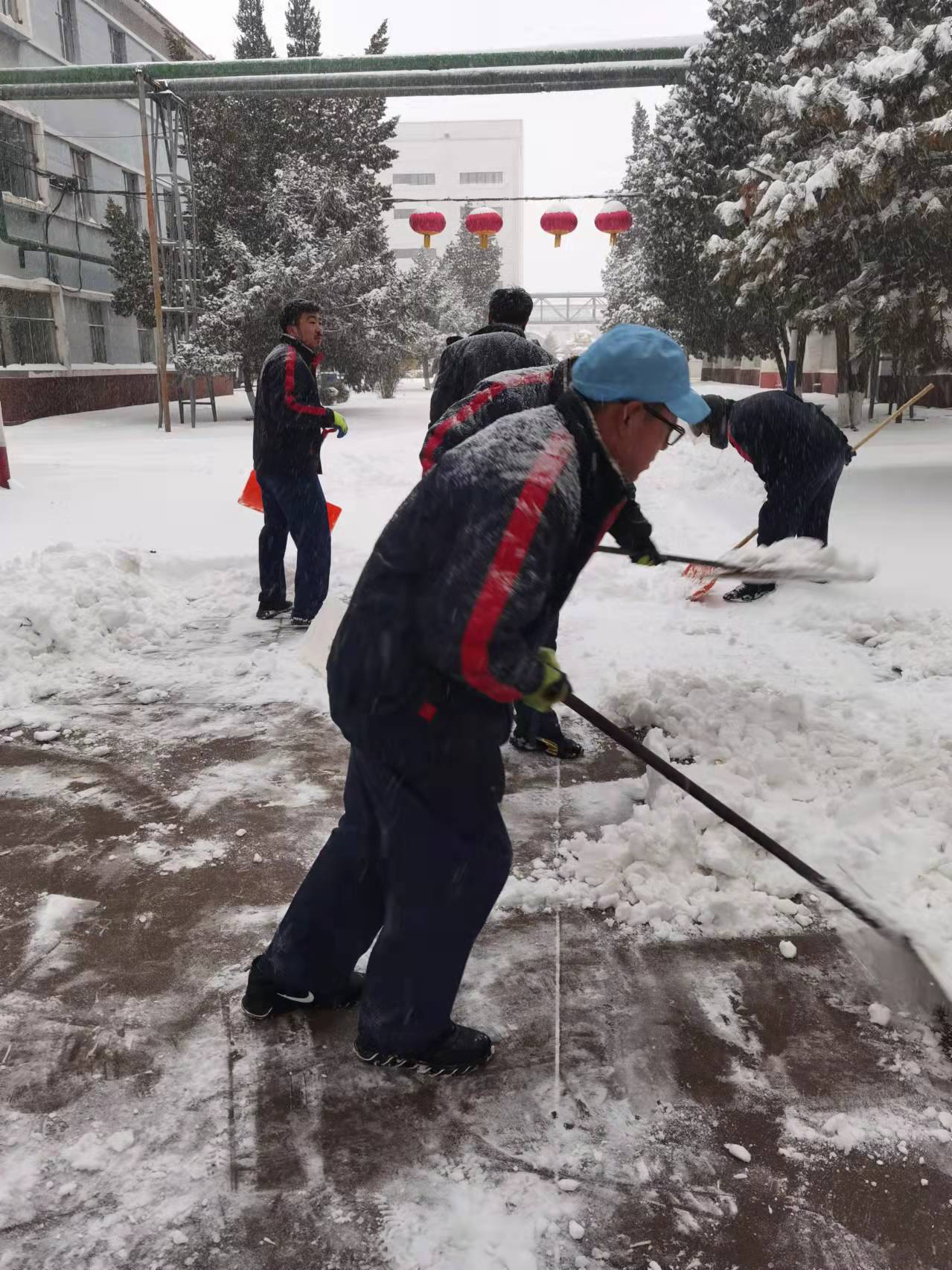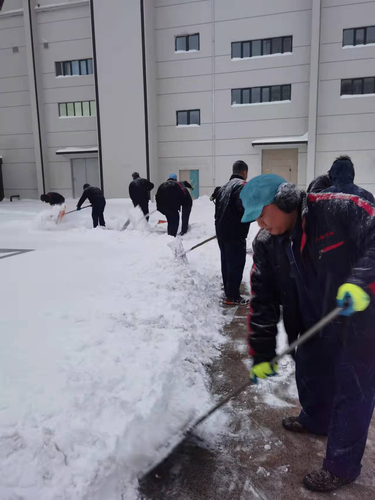 面對公司廠區(qū)內的積雪,為了保證明天上班后的順利開工,九泰人沒有等靠,公司行政部郭春風副總經理積極安排布置,通知包裝中心、運輸班、綠化班、食堂的部分員工步行來到了公司,對公司院內主要道路以及通往食堂沿街路面的積雪進行清掃。